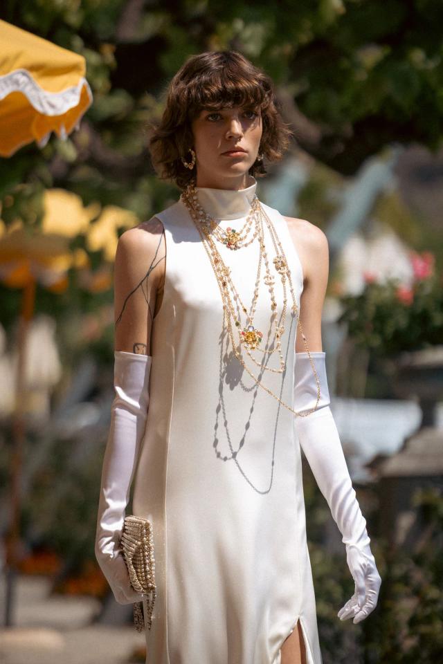 短款黑色塔夫绸裹胸连衣裙搭配优雅的披肩,让人对轻松舒适的生活和美好的夏日向往。象牙白色宽袖衬衫的编织滚边绣有珠子和莱茵石,点亮了白色塔夫绸晚装裤。长款塔夫绸宴会裙和象牙白色西装充满了电影感。