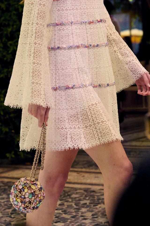 这个早春度假系列发布会并不吝啬。香奈儿车间的生产工艺被应用到服装和配饰的每一个细节中。珍珠项链、硬式晚宴包、大型游泳池包、好莱坞电影明星风格的长手套、黑色太阳镜、油漆蜂蜜凉鞋、头发、手腕或脚踝结合凉鞋的丝巾,都凸显了永恒的魅力和大胆前卫的态度。