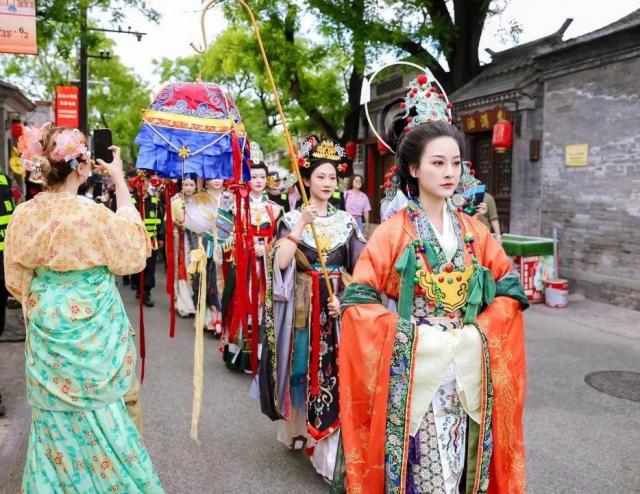 在模式口历史文化街区,法海寺壁画人物服装主题巡游和礼服走秀惊艳亮相。