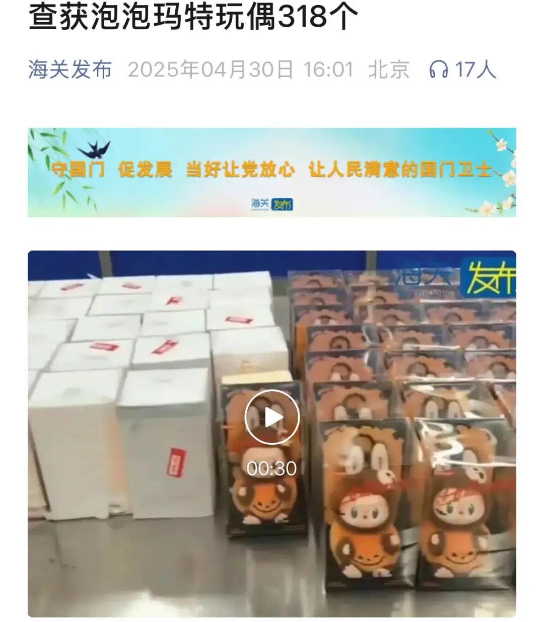 2月28日,厦门机场海关查获70个泡泡玛特娃娃;4月24日,长沙机场海关查获318个泡泡玛特娃娃。就连“真贝儿”也发生在labubu上。4月份,上海海关查获了600多个与labubu非常相似的搪胶娃娃,网友称之为ladudu。