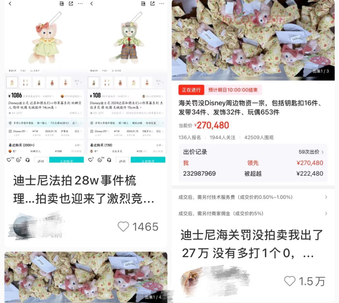 四月二十四日,JD.COM拍卖发布了一批迪士尼周边地区,包括16个钥匙扣、34个发带、32个头饰和653个娃娃,共计735个,起拍价32480元,保证金7000元。