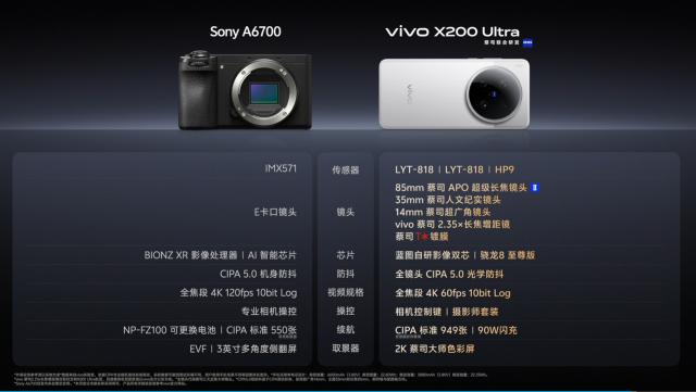 而且是目前唯一能拍全焦段的全焦段。 4K 60fps 10bit log 视频安卓机,视频录制规格一举超越苹果,蓝厂甚至在发布会上直接拿走了。 X200 Ultra 与相机相比,虽然这样做有碰瓷的嫌疑,但是它的实力就在那里。