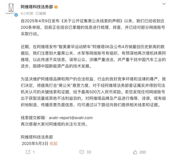 阿维塔科技法务部也在 5 月 3 日发文称,自 2025 年 4 月 9 到目前为止,日本发布了《关于公开征集黑色公关线索的声明》,我们已经收到了近期的信息。 200 本文检举,目前正结合已掌握的信息进行整理、排查,并已将部分网络账号付诸行动。为了坚决维护阿维塔品牌和用户的合法权益、良好的行业竞争环境和法律尊严,我们决定提高对“黑公关”的奖励力度,给予阿维塔法务部核实属实、司法部门认可的关键线索和证据最高。 500 奖励万人民币。