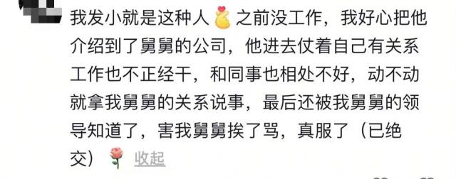 "托家人关系给发小找了份工作,结果到公司到处跟别人说,逼得家人的工作也出了问题。"