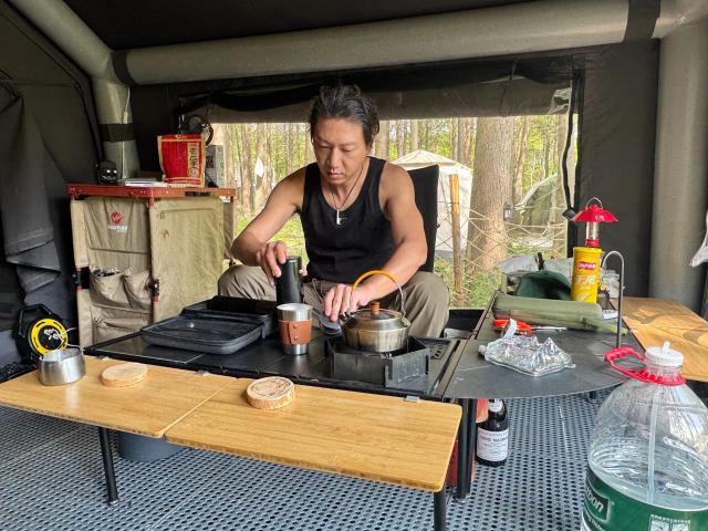 木帐篷虽小,但沙发、茶几、矮床、羊毛地毯、咖啡壶等物品一应俱全。10 平方米不到空间,卧室和客厅也是分开的。"就像成年人的‘过家家’一样。"木子这样描述自己的露营生活,"在这里除了考虑吃饭,就是睡觉,生活变得特别原始、简单。" 2023 2008年,在朋友的推荐下,木子开始接触露营,城市的喧嚣被小溪鸟鸣所取代,积累的工作压力也在燃烧篝火中消退。“这儿的宁静让我重新找回了内心的秩序感。"木子说。