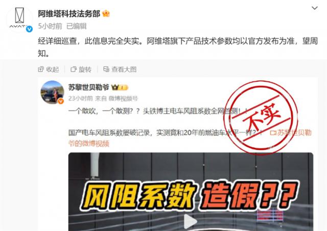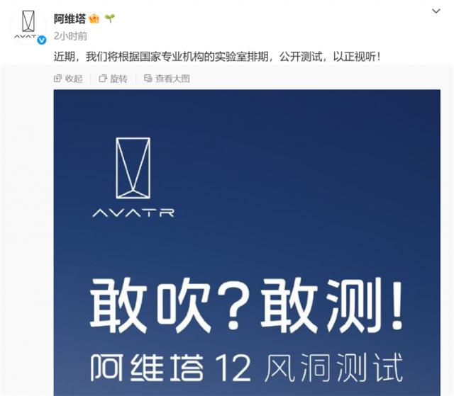 很快,阿维塔官方回复了“风阻造假”的谣言,称这一信息完全不真实,并表示将根据中国专业机构的实验室时间安排进行阿维塔。 12 公开测试。