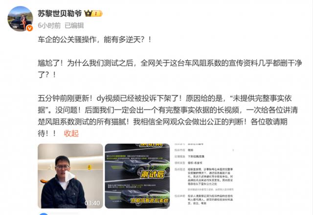 显然,阿维塔的官方帖子意味着风阻测试博主是黑色公关。然而,博主也非常努力。当他看到阿维塔公开测试时,他说他可以提供一个量产版的阿维塔。 12 进行检测。