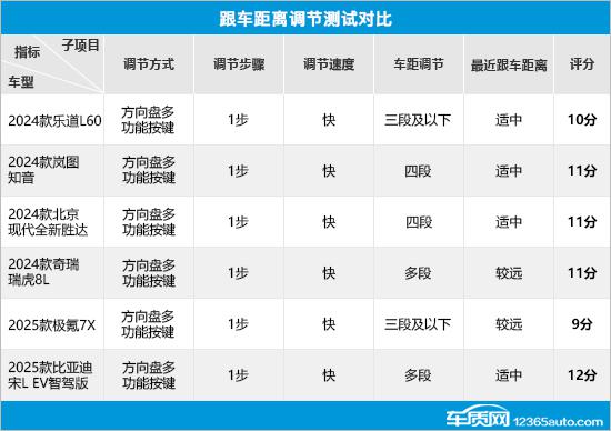 对比后续距离项目,比亚迪宋 L EV 智能驾驶版整体表现最好,其他车型或多或少都有扣分。调整步骤和调整速度没有问题。区别主要表现在车距调整和最近的车距。乐道 L60 和极氪 7X 车距调整性能最差,仅支持三段及以下区间调整,精细化程度略有降低。而且近期跟车距离测试环节,大部分车型都能保持适中距离,瑞虎 8L 和极氪 7X 都离前面的车很远,间距设定得有些传统。实际驾驶过程中,较远的跟车距离很容易受到社会车辆的“堵塞”,反而会给正常驾驶带来麻烦。总的来说,极氪 7X 这个阶段失分严重,导致最终得分垫底。