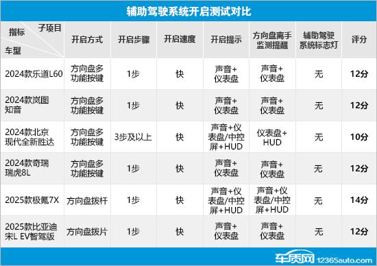 根据横向对比结果,有些车型是通过多功能方向盘上的按钮打开的,有些车型是通过方向盘拨杆或方向盘拨片打开的。虽然开启方式不同,但只有 2024 北京现代全新胜达(以下简称全新胜达)的操作需要 3 步骤或以上,日常使用稍显繁琐。总体来看,2025 款极氪 7X(以下简称极氪) 7X)综合表现最为突出,在辅助驾驶系统开启检测对比时,除辅助驾驶系统标志灯外,其它环节均得满分。2024 款乐道 L60(以下简称乐道) L60)、2024 款岚图知音(以下简称岚图知音)、2024 款奇瑞瑞虎 8L(以下简称瑞虎) 8L)和 2025 款比亚迪宋 L EV 智驾版(以下简称比亚迪宋 L EV 智驾版)表现平淡无奇,没有明显的槽点。值得注意的是,这次横评的参与者 6 车辆支持方向盘离手监控功能,但在车辆外部没有配备辅助驾驶系统标志灯,无法给其他路面参与者明显提示。
