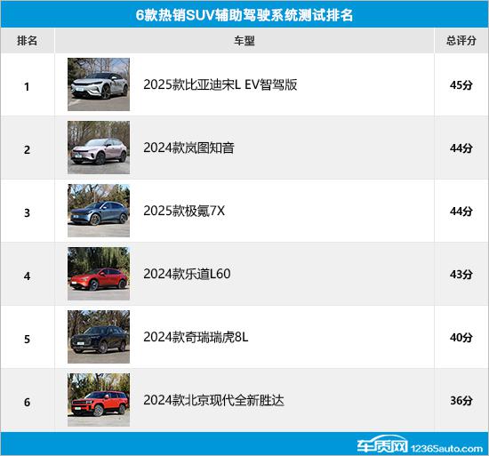 通过这次横评,我们可以发现全新的胜达是 6 唯一一辆车的总得分低于 40 分型车型,作为合资品牌“独苗”,其整体表现与同台对比的自主品牌车型确实存在一定差距。比亚迪宋得分最高。 L EV 智能驾驶版,达到 45 分数,分数比较突出。岚图知音和极氪 7X 稍逊一筹,两款车型都得到了。 44 分。其次是乐道 总分为L60 43 分。自主品牌车型中,得分最低的是瑞虎 8L,但其整体表现仍基本达到预期,不存在严重失分现象。事实上,参与横评的人 6 在辅助驾驶系统测试中,车辆或多或少存在一些问题。希望厂商在后续车型升级中不断优化改进,给车主带来更安全便捷的辅助驾驶体验。