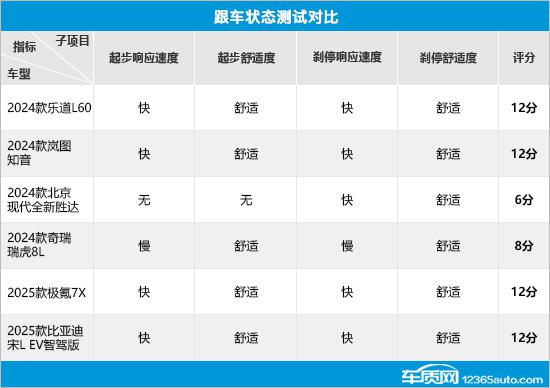 随车状态检测中,乐道 L60、岚图知音,极氪 7X 和比亚迪宋 L EV 智能驾驶版都得了满分,表现出色。相对而言,瑞虎 8L 只是在起步和刹车响应速度上略有失分。另一方面,对于全新的胜达来说,问题主要是不支持自动跟车的起步功能,所以在起步响应速度和舒适性上没有取得任何成就。