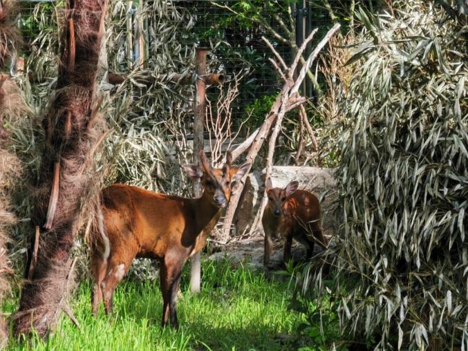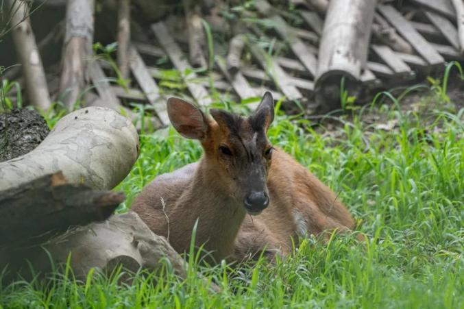 现在,赤麂已经正式进入新展区(长颈鹿馆隔壁)。在华南和西南地区,赤麂主要分布在温暖潮湿的山林和草丛中。为了让赤麂的生活环境更符合野外栖息地环境,饲养员也煞费苦心地布局新展区。随着棕榈树和铁树的到来,雨林风瞬间升起;柚子树和橘子树是主要生活在热带和亚热带地区的常绿果树,也悄然出现在赤麂展区;表面还有新鲜多汁的苏丹草,连赤麂休息的小屋周围都覆盖着竹枝。环顾四周,整个展区郁郁葱葱。一片生机勃勃,伴随着清脆悦耳的鸟鸣,仿佛置身于山野林中。
