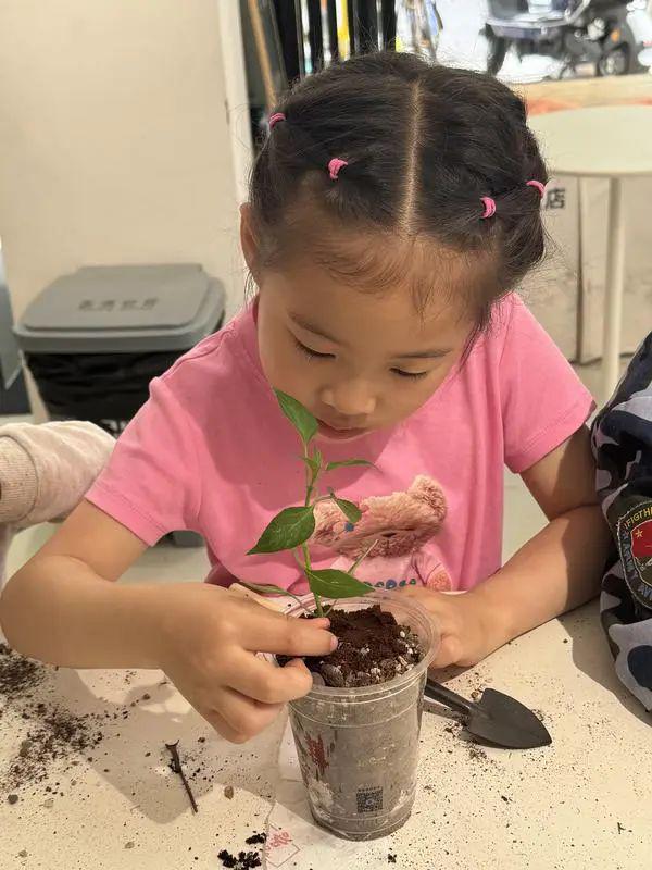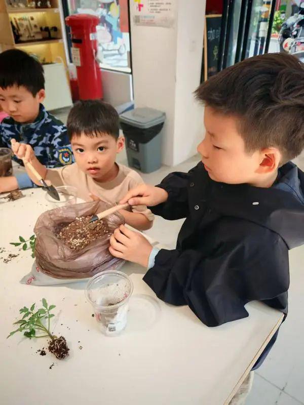 在专业人士的悉心指导下,孩子们像一群用心的小工匠一样拿起小铲子,开始忙碌起来。首先,他们在种植坑底均匀地铺上咖啡渣,仿佛在为番茄苗铺上一层温暖的“营养被”;然后,小心翼翼地把番茄苗放进坑里,专注的表情似乎在呵护一件稀世珍宝;最后,每一个动作都做得很好,充满了对生活的敬畏和期待。