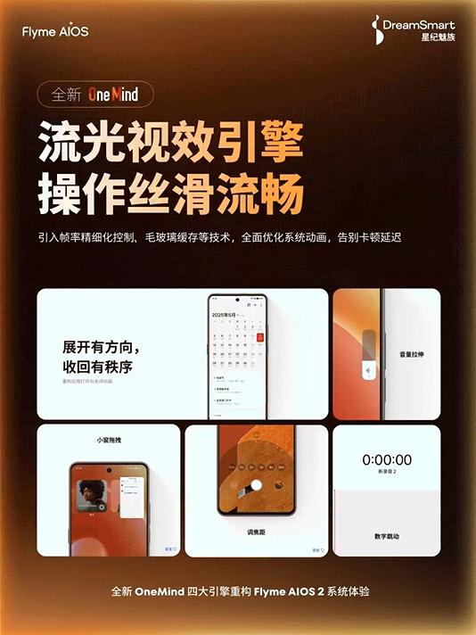 按魅族预热,Flyme 12 重构全新 OneMind 四大发动机,四大发动机分别是快速顺畅发动机,重构系统感受顺畅;流光视觉效果发动机,操作流畅;晶核能效发动机,续航更耐用;智能修复发动机,保护全过程无忧。