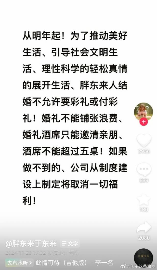 甚至可以猜测,就像胖东来在零售行业的标杆效应一样,胖东来也可能想在拒绝高额彩礼、建立健康婚姻习俗上率先树立榜样。