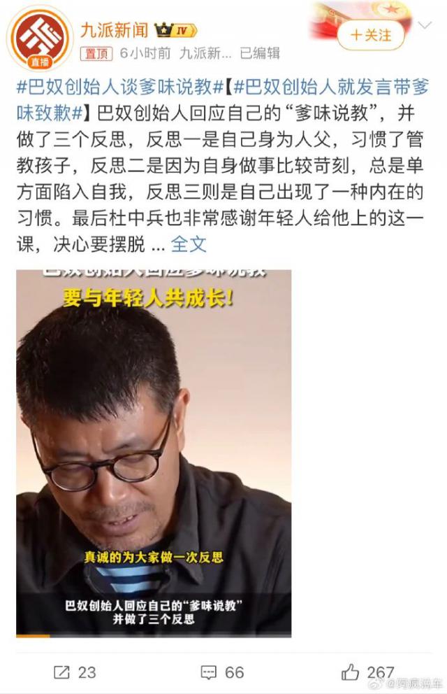 虽然杜中兵在道歉视频中的态度极其卑微,但有些搞笑的是,他说以后要戒掉爹的味道,停止说教,与年轻人保持平等沟通,但在视频的最后,他强调,希望年轻人能够继承“勤俭节约、努力奋斗”的中华传统精神。这不也是说教吗?