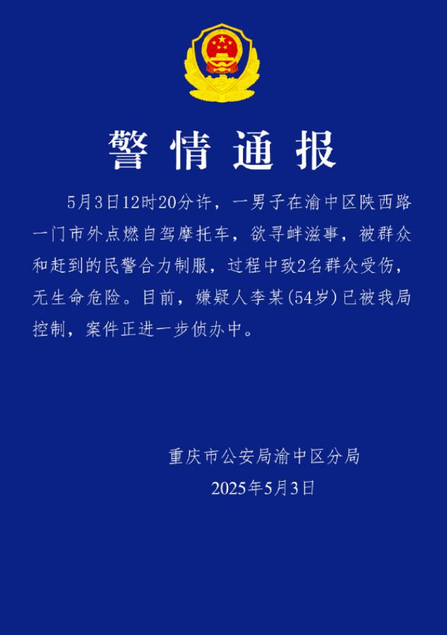 该男子在重庆渝中区点燃了自驾摩托车,并由群众和警察联合制服。 2 著名的群众受伤。