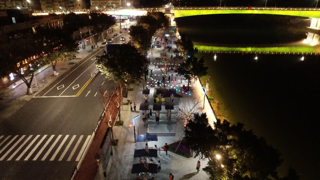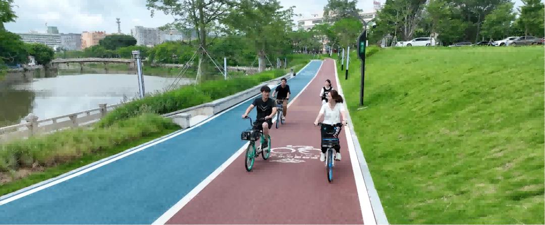 天沙河碧道北起华盛路,南至胜利路;江门河北岸碧道北起江滨公园,南至江会路。碧道花园就像一条绿色的丝带,在城市中慢慢进行,围绕着市民的生活。在碧道上漫游,城市交通繁忙,河水静静流淌,微微吹着凉风,心慢慢伸展。