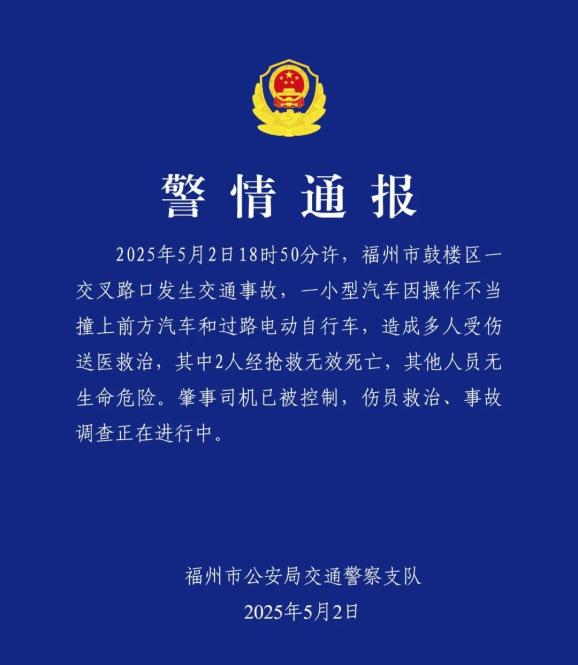 2025年5月2日18时50分左右,福州市鼓楼区某路口发生交通事故。一辆小型汽车因操作失误撞上了前方汽车和过路电动自行车,导致多人受伤送往医院治疗。其中两人因抢救无效死亡,相关人员无生命危险。肇事者已被控制,正在进行伤者治疗和事故调查。