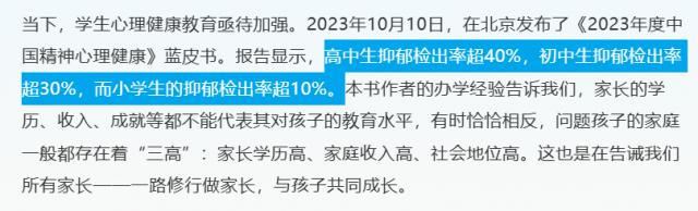 《2023 2008年中国精神心理健康蓝皮书指出,高中生抑郁症的诊断率超过 初中生抑郁症的诊断率超过40% 与学生相比,30%的抑郁症诊断率超过 10%。