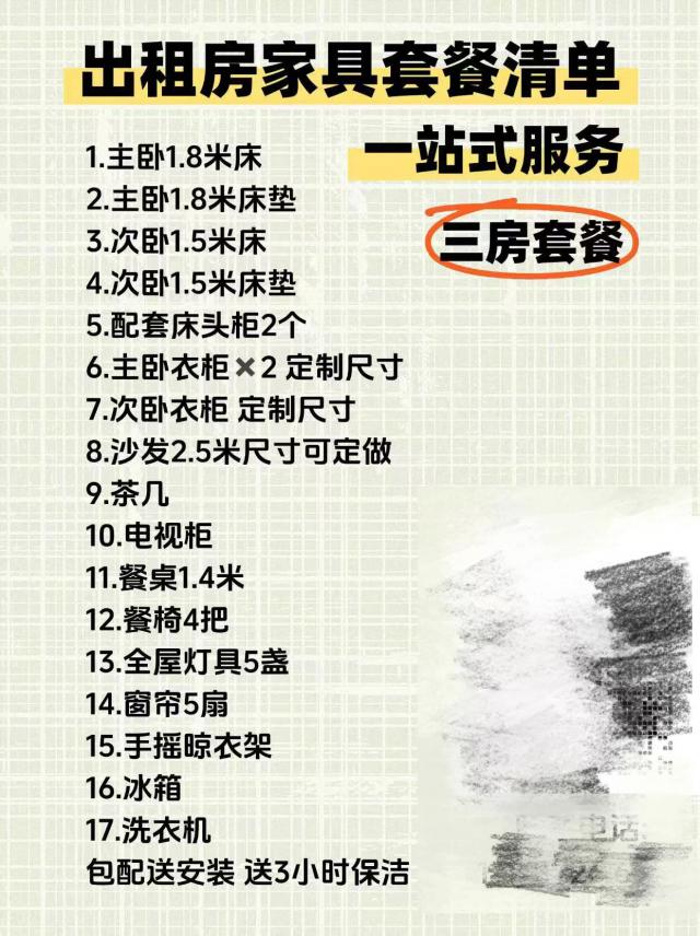 包括:床、沙发、餐桌、椅子、灯、电视柜、衣柜、窗帘、冰箱、洗衣机等等