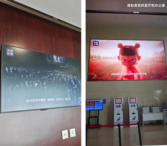 △南航在办公楼播放《致敬中国电影》 120 年》。