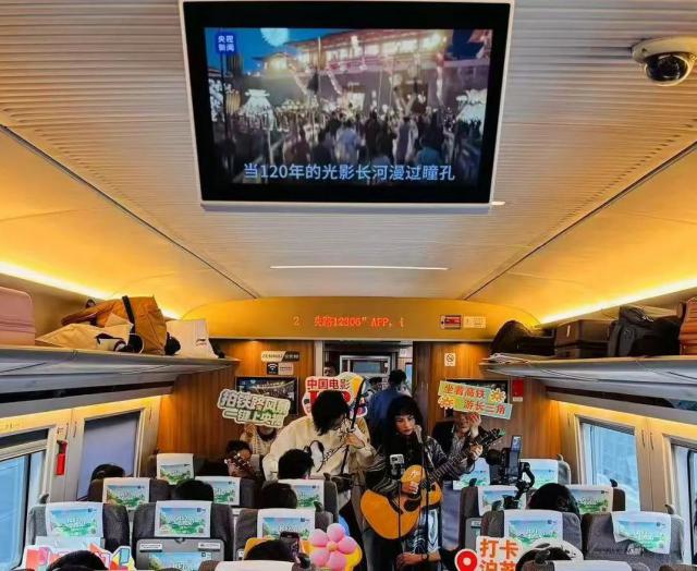 △“闪耀中国红”号主题列车播放《致敬中国电影》 120 年》。
