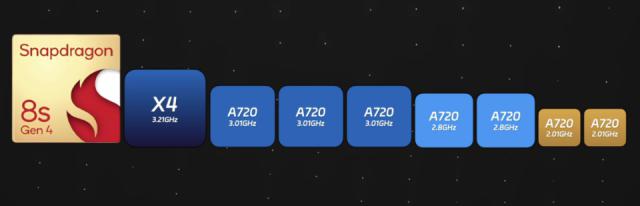 1 颗 Cortex-X4 加上超大核 7 颗 Cortex-A720 全核设计,配备全新的切片架构 Adreno 825 GPU。