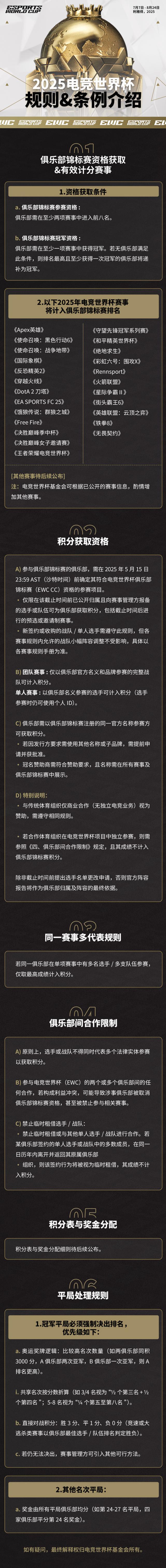 IT 世家 5 月 3 日消息,2025 中文版《电竞世界杯赛事规则》 5 月 2 每天正式发布,规则分为六个部分:俱乐部公开赛资格获得 & 有效记分比赛,获得积分资格,同一比赛多代表规则,俱乐部间合作限制,积分表和奖金分配(等待后续公布)、平手处理规则。