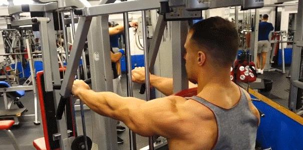 使用龙门架交叉索结构来创造持续的张力。双手更换抬起时,保持身体的冠状表面稳定,抵抗旋转扭矩。峰值收缩时注意小指高于拇指,加强中束旋转功能。