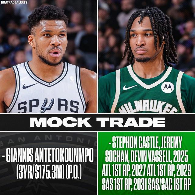 再次看看马刺的交易计划:马刺队把卡斯尔送出去 索汉 瓦塞尔 2025 年首轮签 2027 年首轮签 2029 年首轮签 2031 年首轮签,同样是 7 换 1 交易得到字母哥。前两轮来自老鹰,2029年 2031年是马刺自己的第一轮。 年是马刺和国王 2 选 1。
