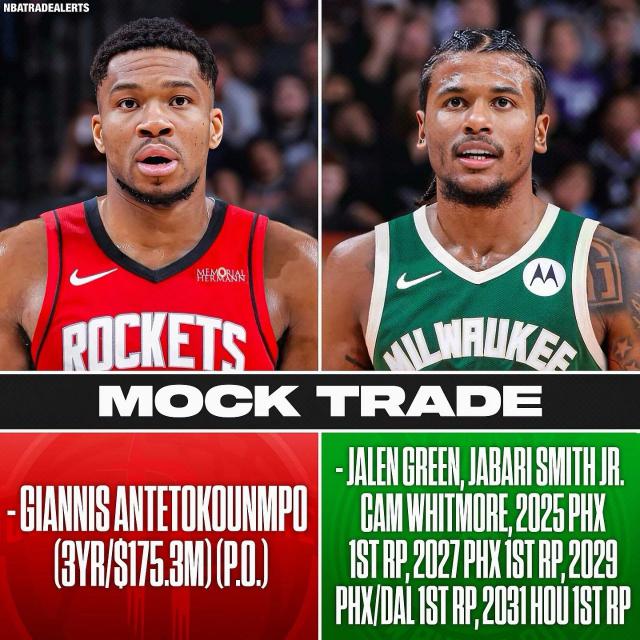 首先我们来看看两个模拟交易方案,哪一个更可靠?火箭队把杰伦送出去 - 格林 小贾巴里 - 史密斯 惠特摩尔 2025 年首轮签 2027 年首轮签 2029 年首轮签 2031 年首轮签,7 换 1 交易得到字母哥。前三个第一轮来自太阳,第四个来自火箭自己。