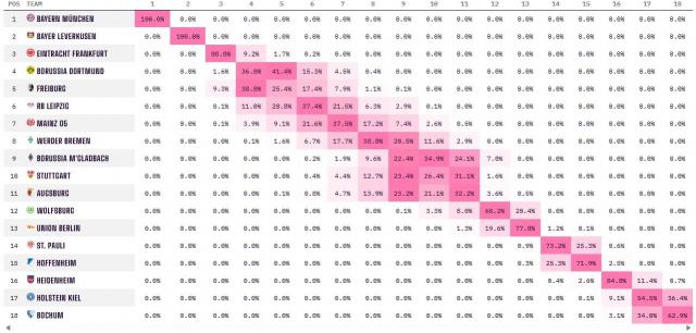 虽然拜仁没能理论上锁定冠军,但基本上也是板上钉钉,毕竟南大王现在多赛一场领先。 9 分,还有 30 一个净胜球的优势,除非他们两连败,勒沃库森每一场狂胜,否则就有可能在冠军争夺中实现前所未有的逆转。opta 在最近的夺冠概率中,拜仁被列为 100%,如果勒沃库森今晚不赢,拜仁将提前夺冠。