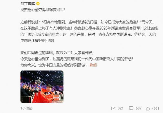 在赵心童夺冠后的第一时间,丁俊晖作为中国斯诺克的“先驱”,在社交媒体上发布了一份文件,祝贺赵心童获得今年的世界锦标赛冠军,并为中国力量在斯诺克的崛起感到自豪。