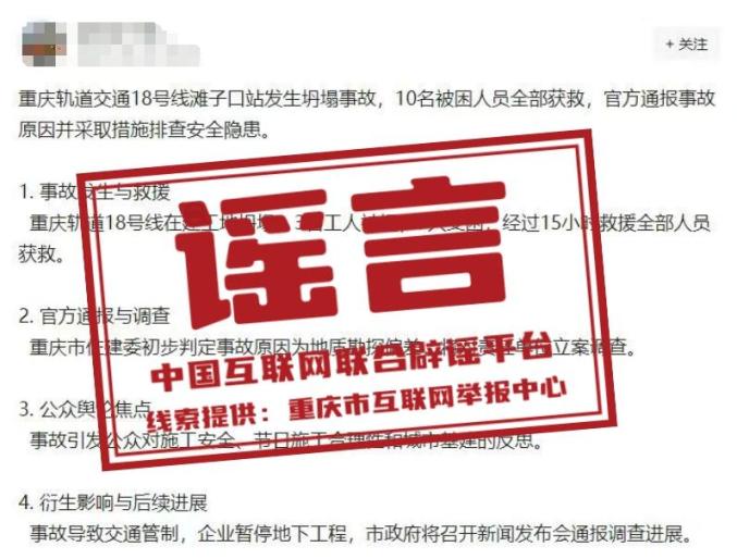 真相:近日,有网友在网络平台上发布消息称“重庆轨道交通18号线滩口站坍塌,10名被困人员全部获救”,引起关注。经核实,网络爆炸信息是谣言。重庆轨道交通18号线滩口轻轨站正在渣场建设中,没有坍塌事故和人员被困。目前,警方已经调查了谣言。(来源:重庆谣言、网信九龙坡)