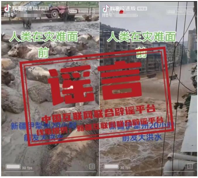 事实:最近,新疆伊犁霍城县萨尔布拉克镇发生了山洪地质灾害,没有造成人员伤亡。然而,一些网民在网络平台上传播了所谓的“洪水冲进主城”、“大量牲畜死亡”等视频,引起了人们的关注。经过验证,这些视频是通过拼接制作的,并不是霍城县萨尔布拉克镇山洪的真实画面。有关视频内容严重失真,属于谣言信息。(来源:“新疆网络辟谣”微信公众号、网信霍城)