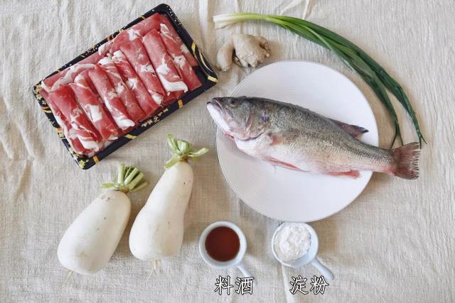 1. 将鲈鱼洗净,用姜片、米酒、盐、淀粉腌渍 15 分钟,萝卜切片。