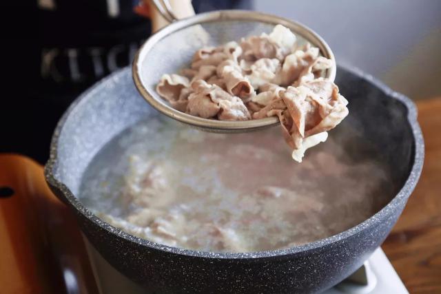 2. 把锅里的水烧开,放进羊肉卷里焯水捞出备用。