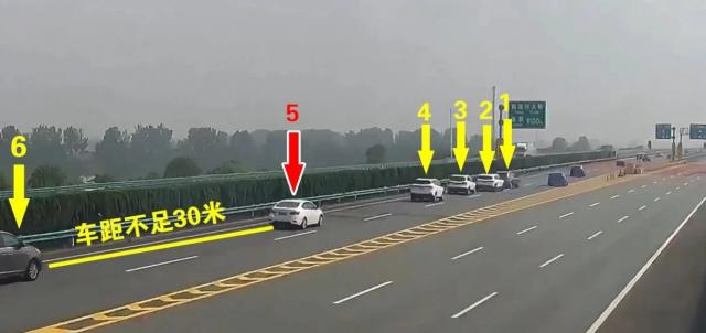 接着是另一辆车(5) 号车)来到这里,及时发现情况,向右避让。并且紧随其后的姚某(66 号车)没有保持安全距离, 5 号车变道后突然发现前方情况,猝不及防地连续撞上前方。 4、3 号码两辆车。大幸事故只造成三车损坏,三人轻伤。