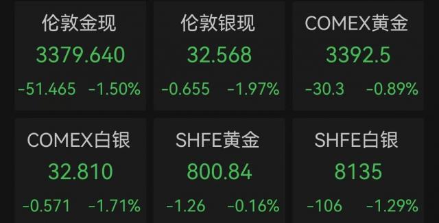 北京时间 5 月 7 那天晚上,伦敦金现在正在下跌 1.5%,跌破 3380 关口;COMEX 黄金期货市场正在下跌 沪金、白银也有不同程度的下跌,0.9%。