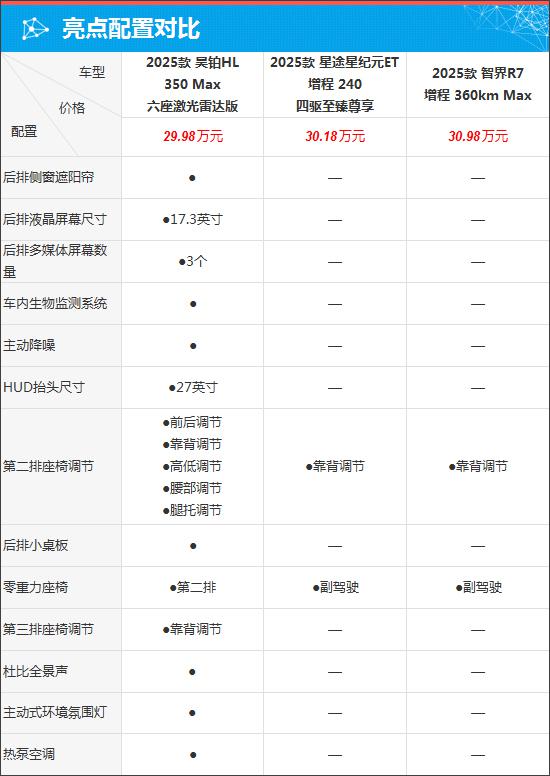 就车辆配置而言,通过对比来看,昊铂 HL 对乘客的照顾非常充分,比如后排液晶屏、第二排座椅多向可调、后排小桌板、第二排零重力座椅、第三排座椅背部可调等配置,这些都是另外两款车型所没有的。同时,它也独自享受 HUD 抬头显示系统、主动降噪、主动环境氛围灯、热泵空调等功能,能显著提升日常用车体验。