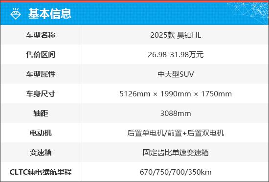 2025 款昊铂 HL 售价区间为 26.98-31.98 一万元,买车可以享受价值 1.5 终身免费充电万元权益;3 年 20 万 0 息(价值约 2.4 万元)金融政策;限时; 2999 元享价值 5000 元尊享服务包(详情请咨询当地经销商)。