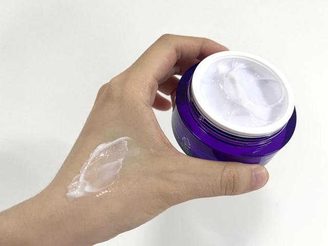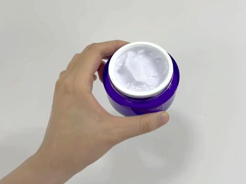 淡紫色冰淇淋霜状材料,触肤轻盈,光滑易涂抹,吸收后处于完全润泽不粘的状态!