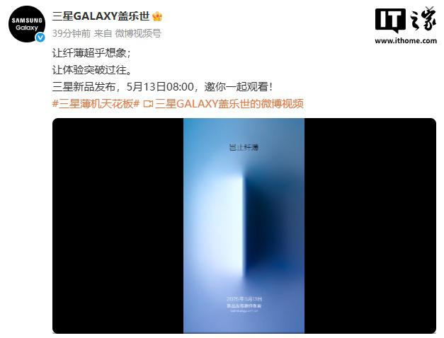 IT 世家 5 月 8 日消息,三星今天正式宣布将在今天。 5 月 13 日 8:00 举行新产品发布会,“让纤薄超乎想象;让感觉突破过去。” slogan 看来,本次发布会有望带来超薄旗舰新机 Galaxy S25 Edge。