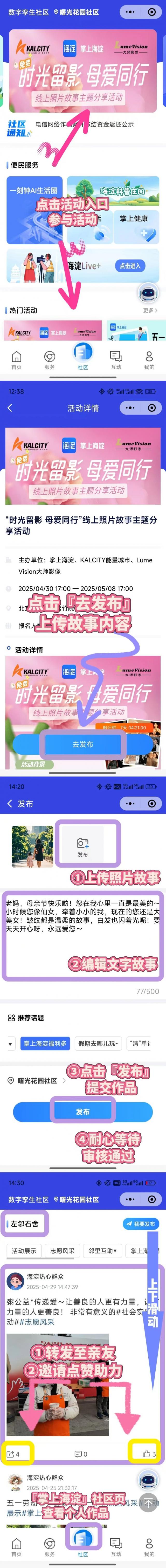 或微信搜索“掌上海淀”小程序,进入【社区】页→【热门活动】→单击活动入口→发布作品→与朋友圈分享“掌上海淀”活动链接,邀请朋友为自己的作品助力点赞!