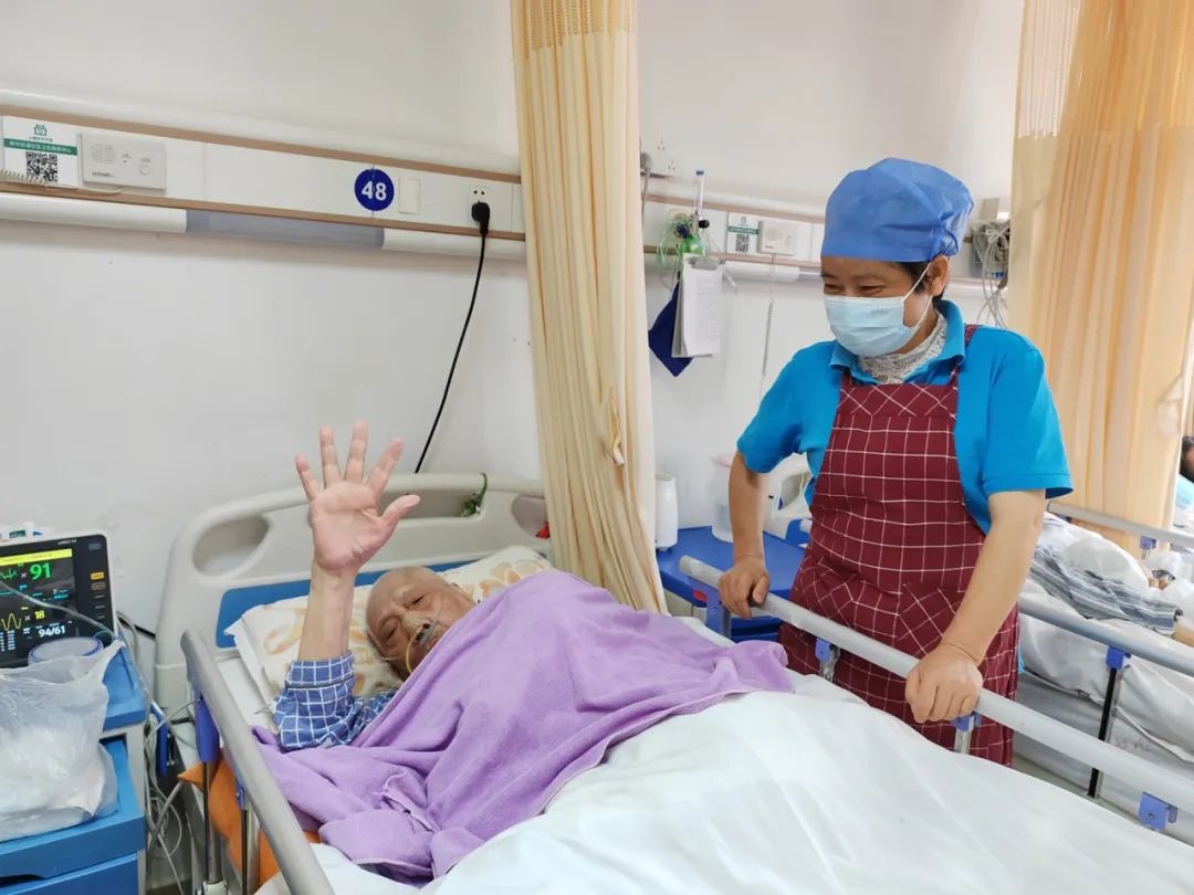 听着陈燕芬的话,坐在陈老伯旁边的妻子孙阿姨有点激动,她迫不及待地想分享自己的经历和感受。妻子刚来时,身体一侧偏瘫,口齿不清,还一直流口水,身上很多地方都有皮疹,最重要的是情绪不稳定。”说到这里,孙阿姨叹了口气。“住在这里后,医护人员一天来检查几次房子,包括药物、理疗、针灸和按摩。...在中西医结合治疗下,妻子的病情迅速好转。治疗过程中,妻子突发脑梗死,医生立即通过绿色通道帮助我们转诊到三级医院。更重要的是,医生、护士和护士经常来和他聊天,逗他开心,像哄宝宝一样安抚他的情绪。”