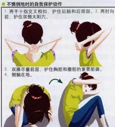 一旦摔倒,尽量向前弯曲膝盖,保护胸腔和腹腔的重要器官,侧躺在地上。双手十指交叉,保护后脑勺和颈部;向前弯曲,保护两侧的太阳穴。试着靠近角落。