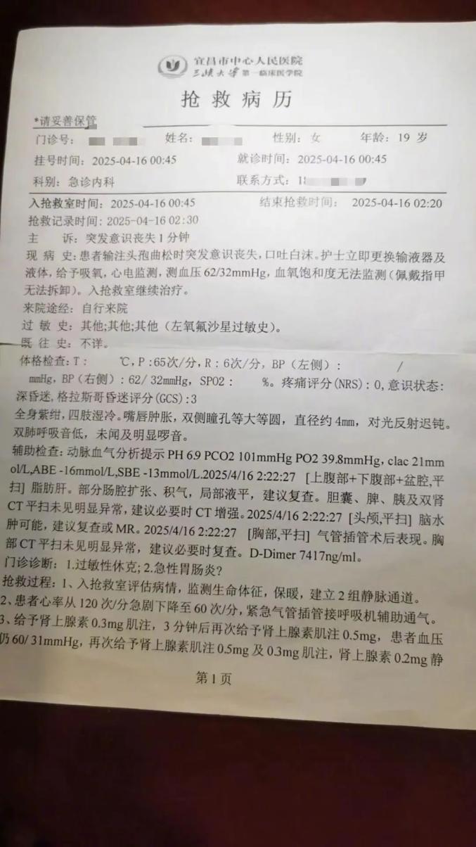 五月六日,小雯的家人向记者讲述了事件的发生。四月十五日22时57分左右,小雯因腹痛呕吐前往宜昌市中心人民医院西陵院区急诊内科就医,三位同学陪同。家人说,小雯正在读大一,平时身体很好,事发当天还和奶奶聊天,“说找奶奶报销200元买鞋的钱”。家人说,入院后,医生问他是否对药物过敏,“小雯说不清楚”。此后,医生向其他药物开出药方,如注射头孢曲松钠、盐酸曲马多注射剂等。家人还表示,根据同学的说法,“小雯曾经咨询过医生,注射头孢是否需要皮试,医生回复不需要”。
