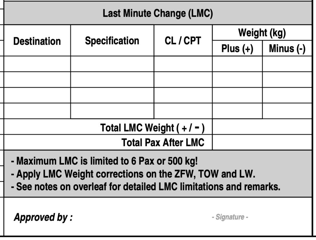 比如下图是某航空公司舱单上的“最后一分钟调整”表。最后一分钟调整可以调整值,与最大的无燃油重量、最大的起飞重量和最大的着陆重量有关。