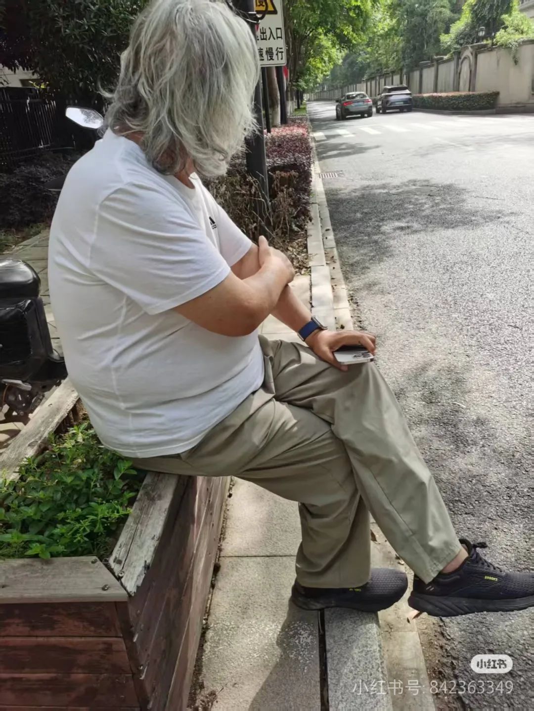 照片中,张纪中留着白发,穿着白色t恤和卡其色裤子,等待交警。他坐在路边的花坛旁,凝视着远处,看起来有点沮丧。